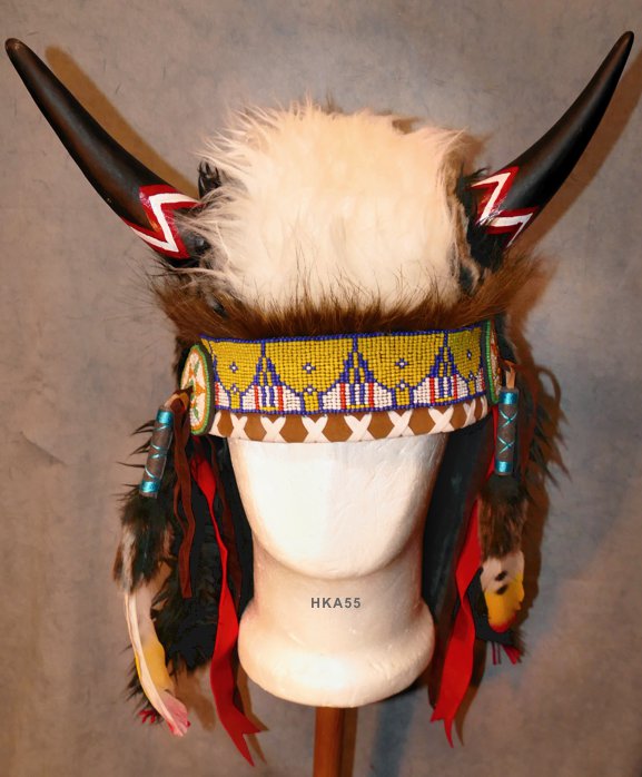 "Hörnerkappe Fell weiss-grau mit Federn"