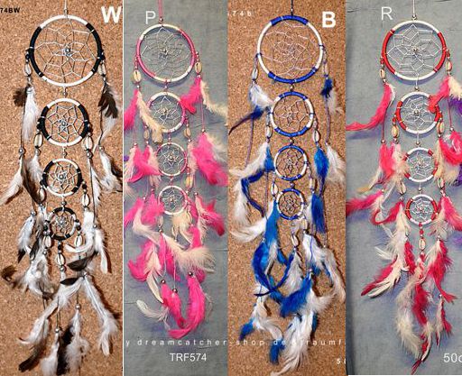 Federn und Zwirn sind farblich auf einander abgestimmt. Kaurimuscheln und Perlen sind in die silberfarben Stränge eingearbeitet.